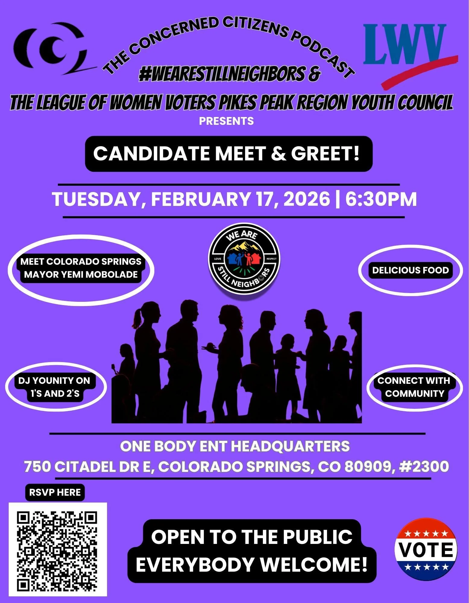 The Concerned Citizens Podcast, #WeAreStillNeighbors & League of Women Voters of the Pikes Peak Region Youth Council would like to invite you to a Candidate Meet & Greet. We hope you are able to drop-in and hear from candidates running for office in 2026. Each candidate in attendance will be given the same time to speak with the main goal being an informal discussion with candidates speaking directly to voters.