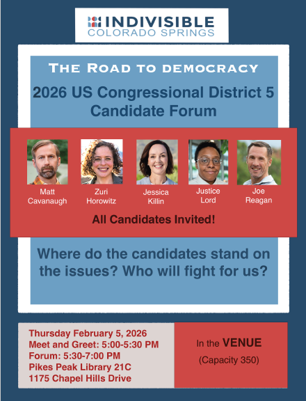 Indivisible Colorado Springs warmly invites you to the U.S. House Congressional District 5 Candidate Forum. Join us from 5:00 pm- 5:30 pm to meet the candidates. Bring your questions, sign up to volunteer for a campaign, and grab a yard sign.